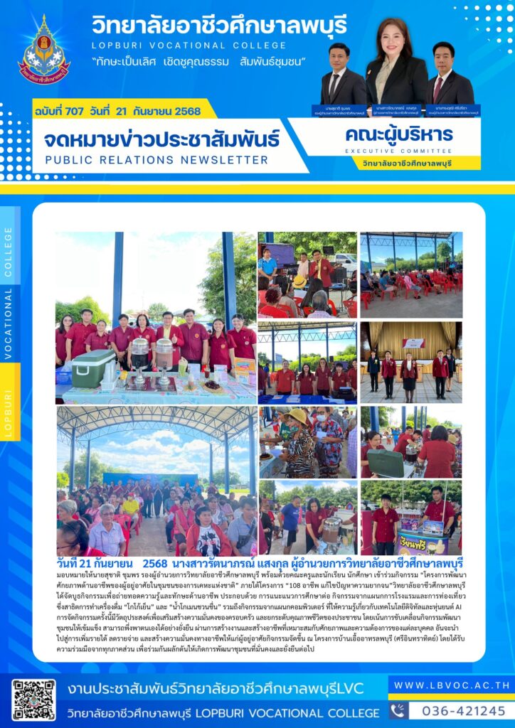 นางสาวรัตนาภรณ์ แสงกุล ผู้อำนวยการวิทยาลัยอาชีวศึกษาลพบุรีมอบหมายให้นายสุชาติ ชุมพร รองผู้อำนวยการวิทยาลัยอาชีวศึกษาลพบุรี พร้อมด้วยคณะครูและนักเรียน นักศึกษา เข้าร่วมกิจกรรม “โครงการพัฒนาศักยภาพด้านอาชีพของผู้อยู่อาศัยในชุมชนของการเคหะแห่งชาติ” ภายใต้โครงการ “108 อาชีพ แก้ไขปัญหาความยากจน”วิทยาลัยอาชีวศึกษาลพบุรีได้จัดบูธกิจกรรมเพื่อถ่ายทอดความรู้และทักษะด้านอาชีพ ประกอบด้วย การแนะแนวการศึกษาต่อ กิจกรรมจากแผนกการโรงแรมและการท่องเที่ยวซึ่งสาธิตการทำเครื่องดื่ม “โกโก้เย็น” และ “น้ำโกเมนชวนชื่น” รวมถึงกิจกรรมจากแผนกคอมพิวเตอร์ ที่ให้ความรู้เกี่ยวกับเทคโนโลยีดิจิทัลและหุ่นยนต์ AIการจัดกิจกรรมครั้งนี้มีวัตถุประสงค์เพื่อเสริมสร้างความมั่นคงของครอบครัว