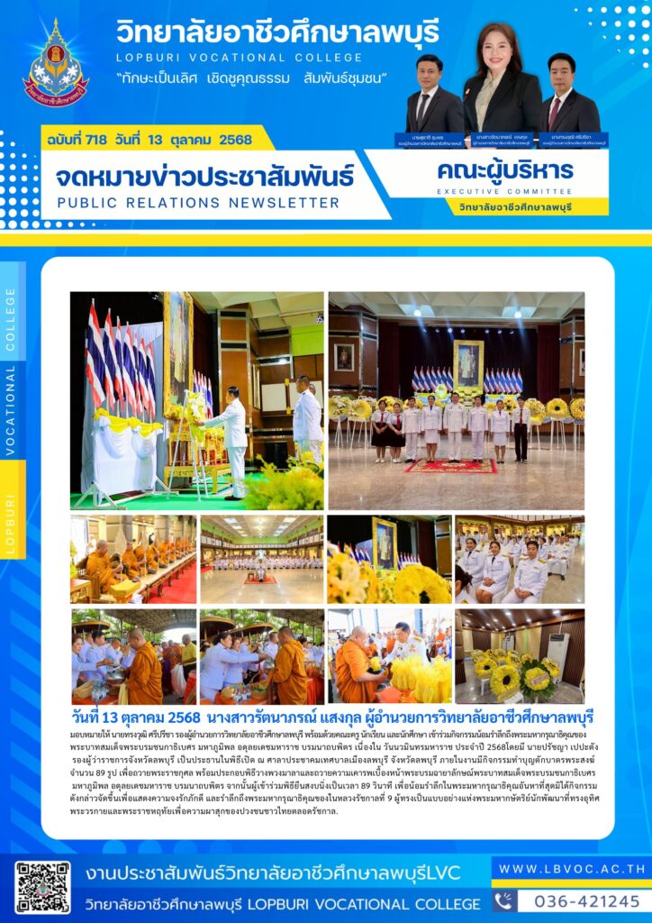 นางสาวรัตนาภรณ์ แสงกุล ผู้อำนวยการวิทยาลัยอาชีวศึกษาลพบุรีมอบหมายให้ นายทรงวุฒิ ศรีปรีชา รองผู้อำนวยการวิทยาลัยอาชีวศึกษาลพบุรี พร้อมด้วยคณะครู นักเรียน และนักศึกษา เข้าร่วมกิจกรรมน้อมรำลึกถึงพระมหากรุณาธิคุณของ พระบาทสมเด็จพระบรมชนกาธิเบศร มหาภูมิพล อดุลยเดชมหาราช บรมนาถบพิตร เนื่องใน วันนวมินทรมหาราช ประจำปี 2568โดยมี นายปรัชญา เปปะตังรองผู้ว่าราชการจังหวัดลพบุรี เป็นประธานในพิธีเปิด ณ ศาลาประชาคมเทศบาลเมืองลพบุรี จังหวัดลพบุรี