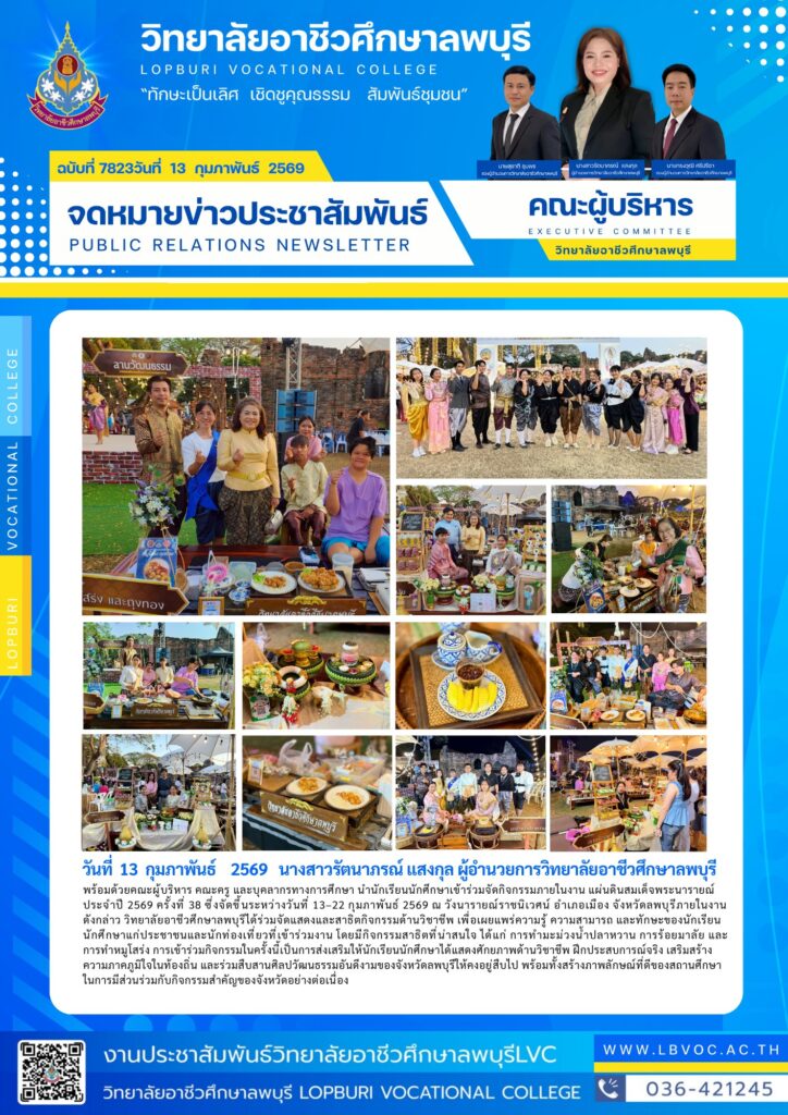 คณะผู้บริหาร คณะครู และบุคลากรทางการศึกษา นำนักเรียนนักศึกษาเข้าร่วมจัดกิจกรรมภายในงาน แผ่นดินสมเด็จพระนารายณ์ ประจำปี 2569 ครั้งที่ 38 ซึ่งจัดขึ้นระหว่างวันที่ 13–22 กุมภาพันธ์ 2569 ณ วังนารายณ์ราชนิเวศน์ อำเภอเมือง จังหวัดลพบุรีภายในงาน ดังกล่าว วิทยาลัยอาชีวศึกษาลพบุรีได้ร่วมจัดแสดงและสาธิตกิจกรรมด้านวิชาชีพ เพื่อเผยแพร่ความรู้ ความสามารถ และทักษะของนักเรียนนักศึกษา