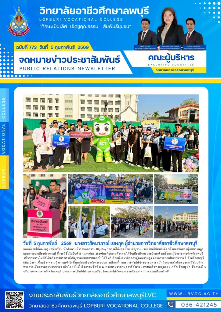 นางสาวรัตนาภรณ์ แสงกุล ผู้อำนวยการวิทยาลัยอาชีวศึกษาลพบุรีมอบหมายให้คณะครูนำนักเรียน นักศึกษา เข้าร่วมกิจกรรม Big Day รณรงค์โค้งสุดท้าย เชิญชวนประชาชนใช้สิทธิเลือกตั้งสมาชิกสภาผู้แทนราษฎรและการออกเสียงประชามติ ซึ่งจะมีขึ้นในวันที่ 8 กุมภาพันธ์ 2569โดยกิจกรรมดังกล่าวได้รับเกียรติจาก นายวีรพงศ์ ฤทธิ์รอด ผู้ว่าราชการจังหวัดลพบุรีเป็นประธานในพิธีเปิดกิจกรรมรณรงค์เชิญชวนประชาชนออกไปใช้สิทธิเลือกตั้งสมาชิกสภาผู้แทนราษฎร
