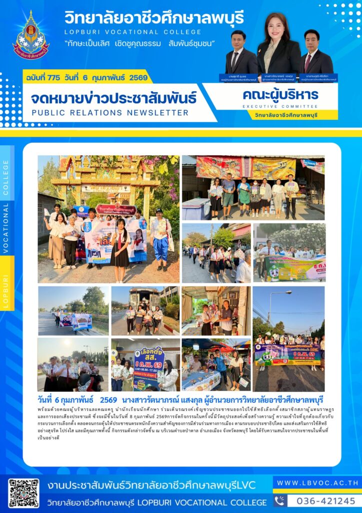 นางสาวรัตนาภรณ์ แสงกุล ผู้อำนวยการวิทยาลัยอาชีวศึกษาลพบุรีพร้อมด้วยคณะผู้บริหารและคณะครู นำนักเรียนนักศึกษา ร่วมเดินรณรงค์เชิญชวนประชาชนออกไปใช้สิทธิเลือกตั้งสมาชิกสภาผู้แทนราษฎร และการออกเสียงประชามติ ซึ่งจะมีขึ้นในวันที่ 8 กุมภาพันธ์ 2569การจัดกิจกรรมในครั้งนี้มีวัตถุประสงค์เพื่อสร้างความรู้ ความเข้าใจที่ถูกต้องเกี่ยวกับกระบวนการเลือกตั้ง ตลอดจนกระตุ้นให้ประชาชนตระหนักถึงความสำคัญของการมีส่วนร่วมทางการเมือง ตามระบอบประชาธิปไตย